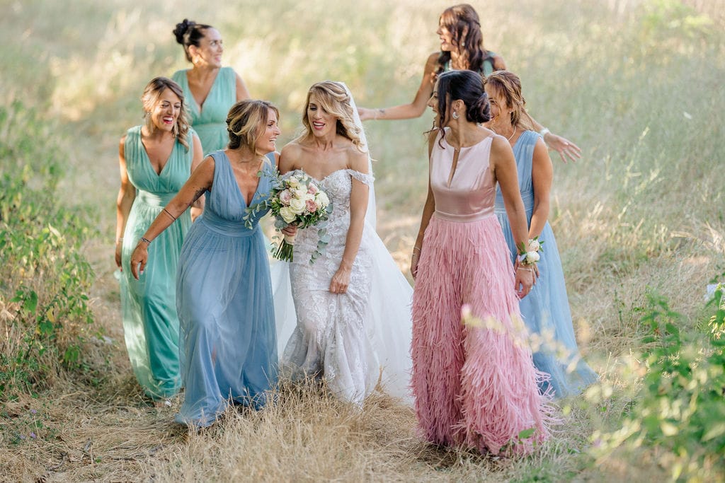 la felicita' della sposa e' contagiosa! circondata da una bellissima corte di damigelle in abiti da cerimonia coordinati..